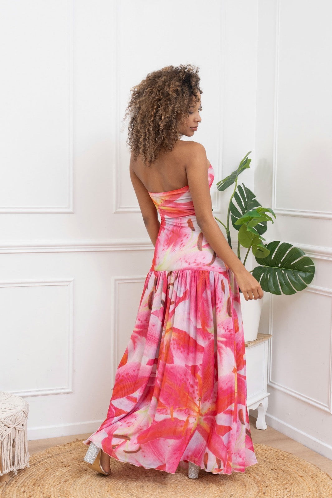 Alizéa évoque les vents tropicaux et les couchers de soleil sur l’océan. Sa coupe fluide et son imprimé floral apportent une touche romantique et sensuelle à ton dressing d’été.