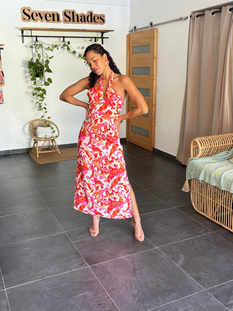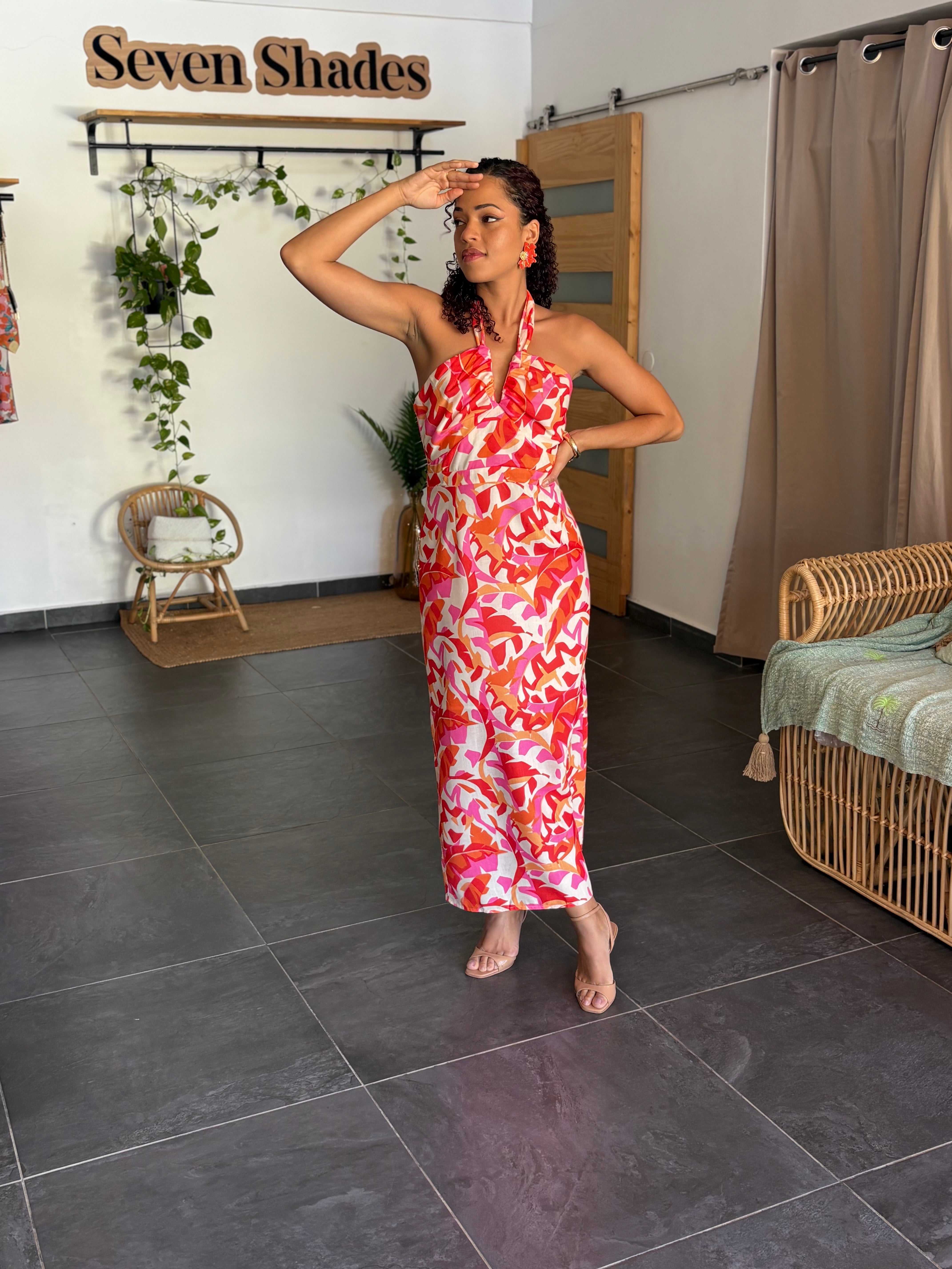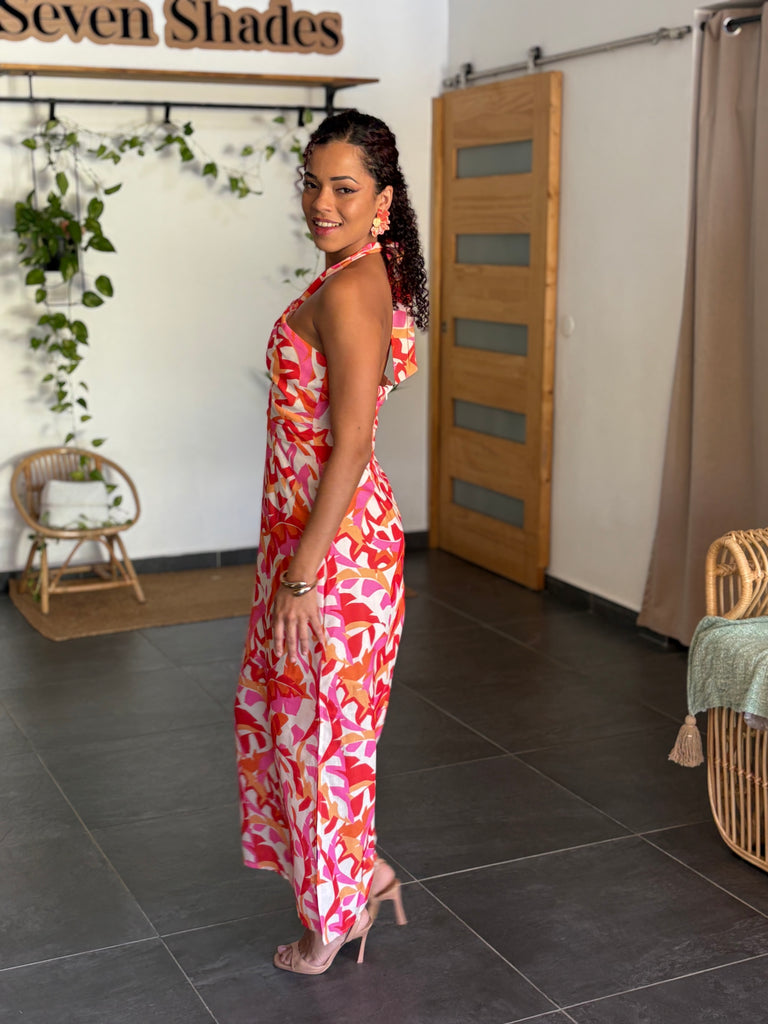 Craquez pour cette robe élégante et chic, avec son dos nu et ses couleurs chaudes et estivales.