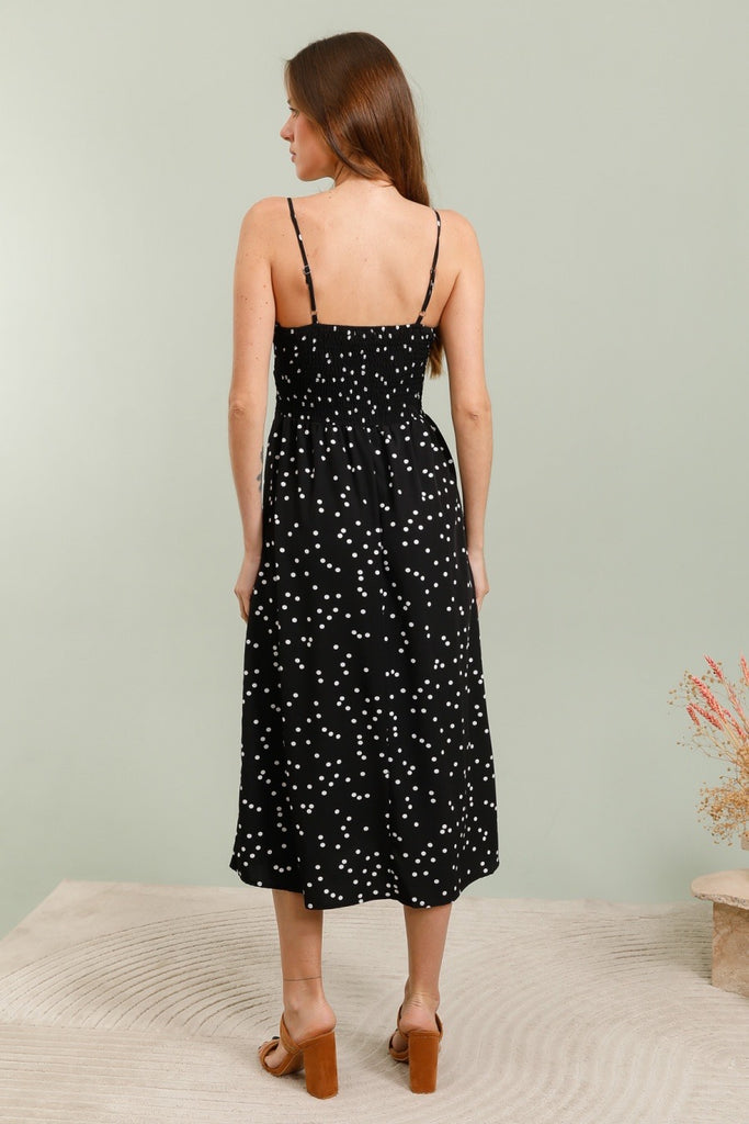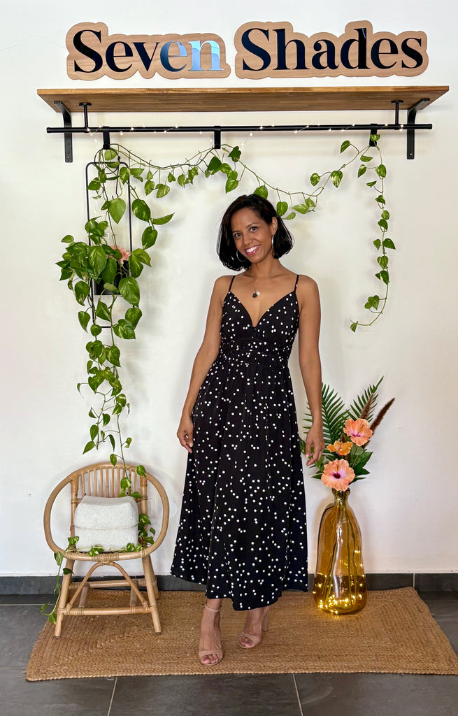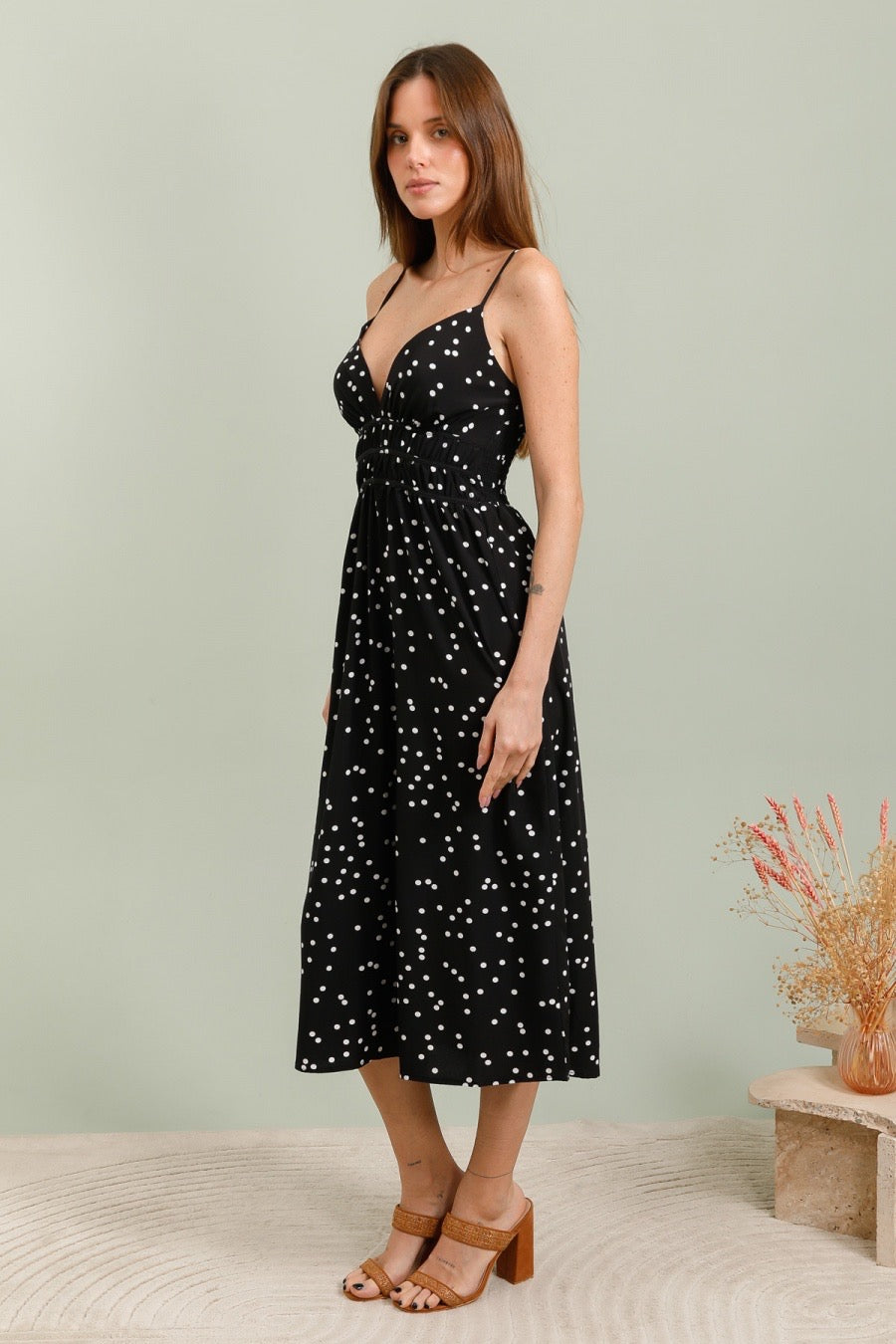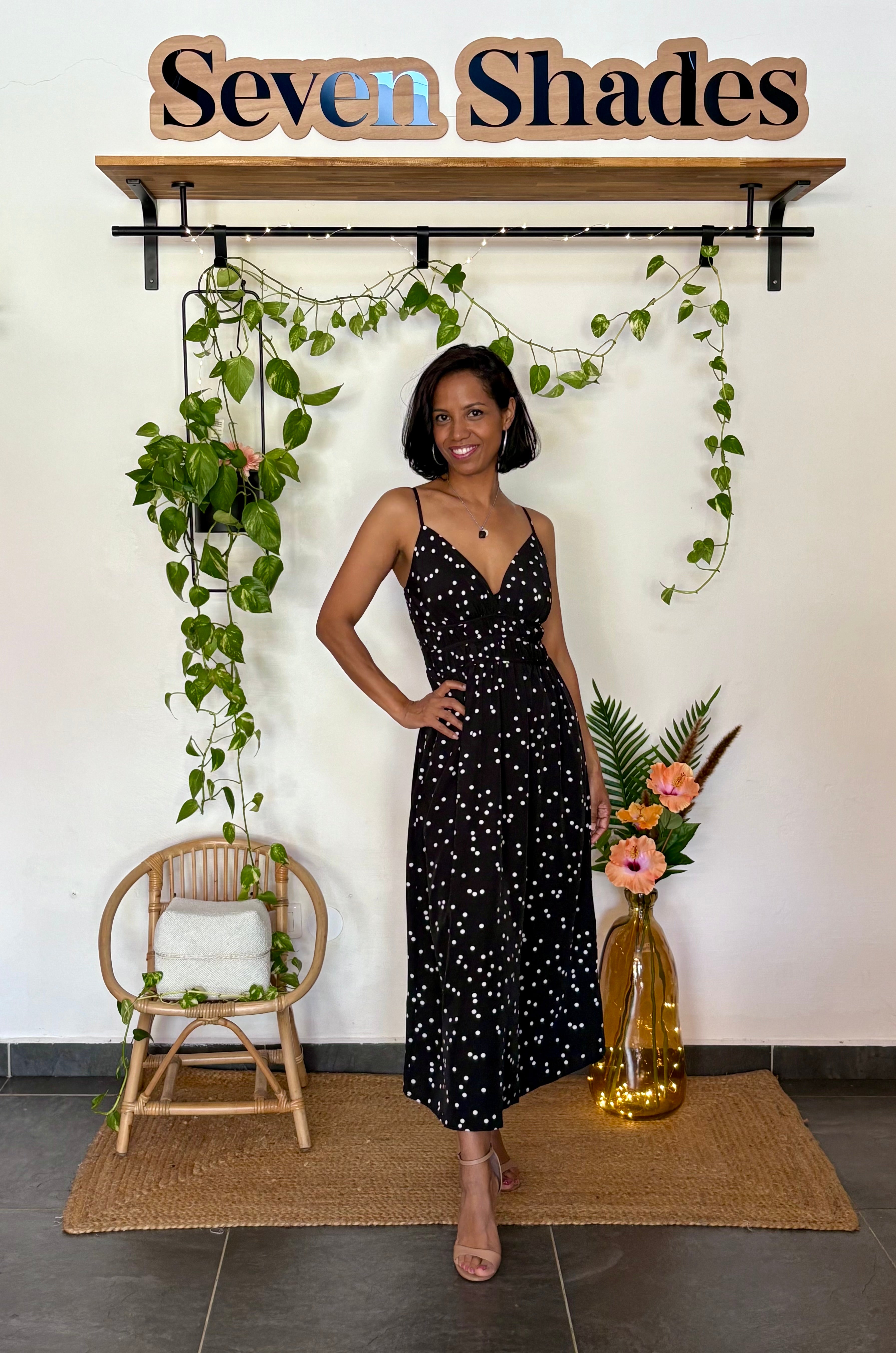 Avec son décolleté en V flatteur, ses bretelles réglables et son détail froncé, cette robe mi-longue à pois sera un incontournable pour toutes les occasions.