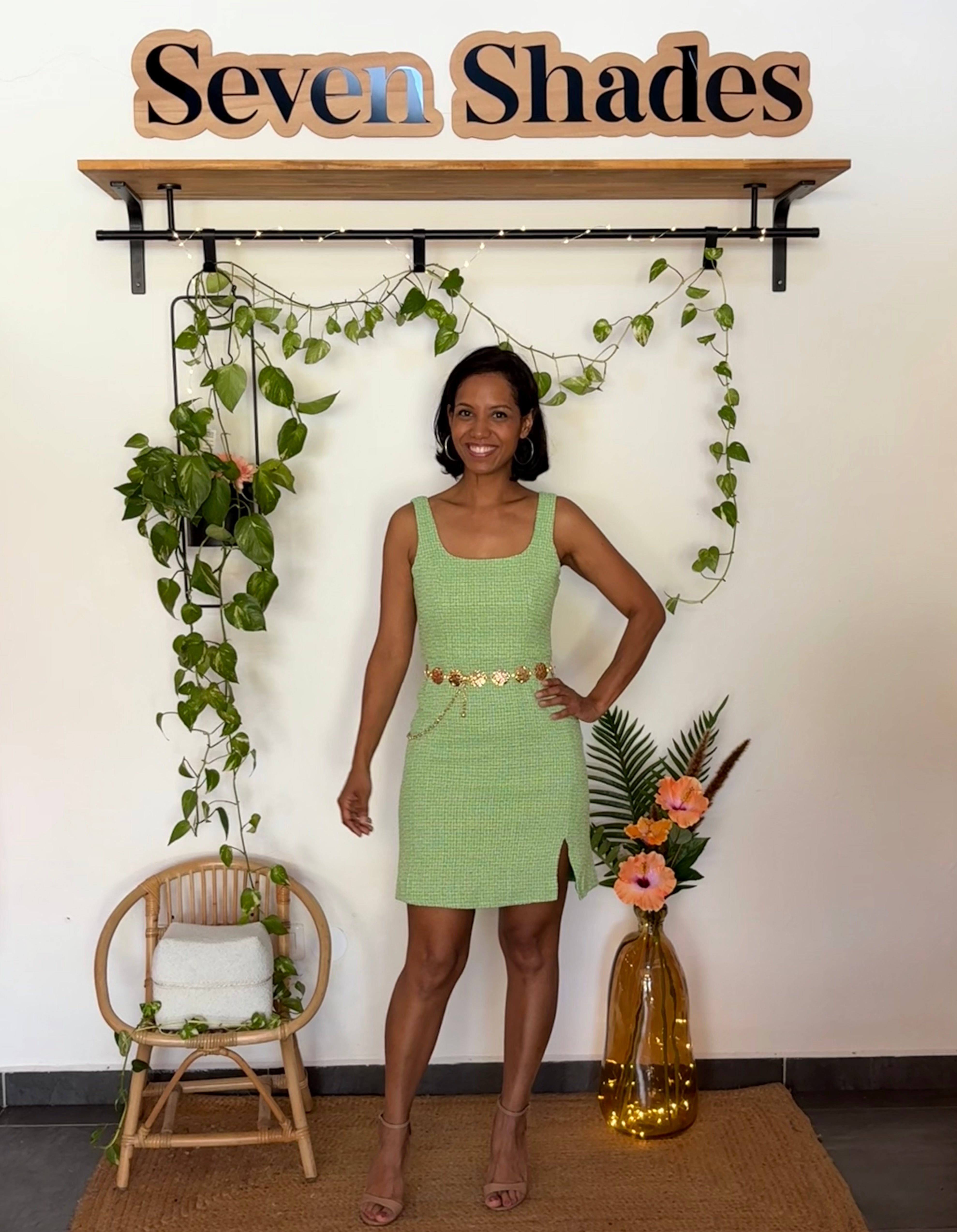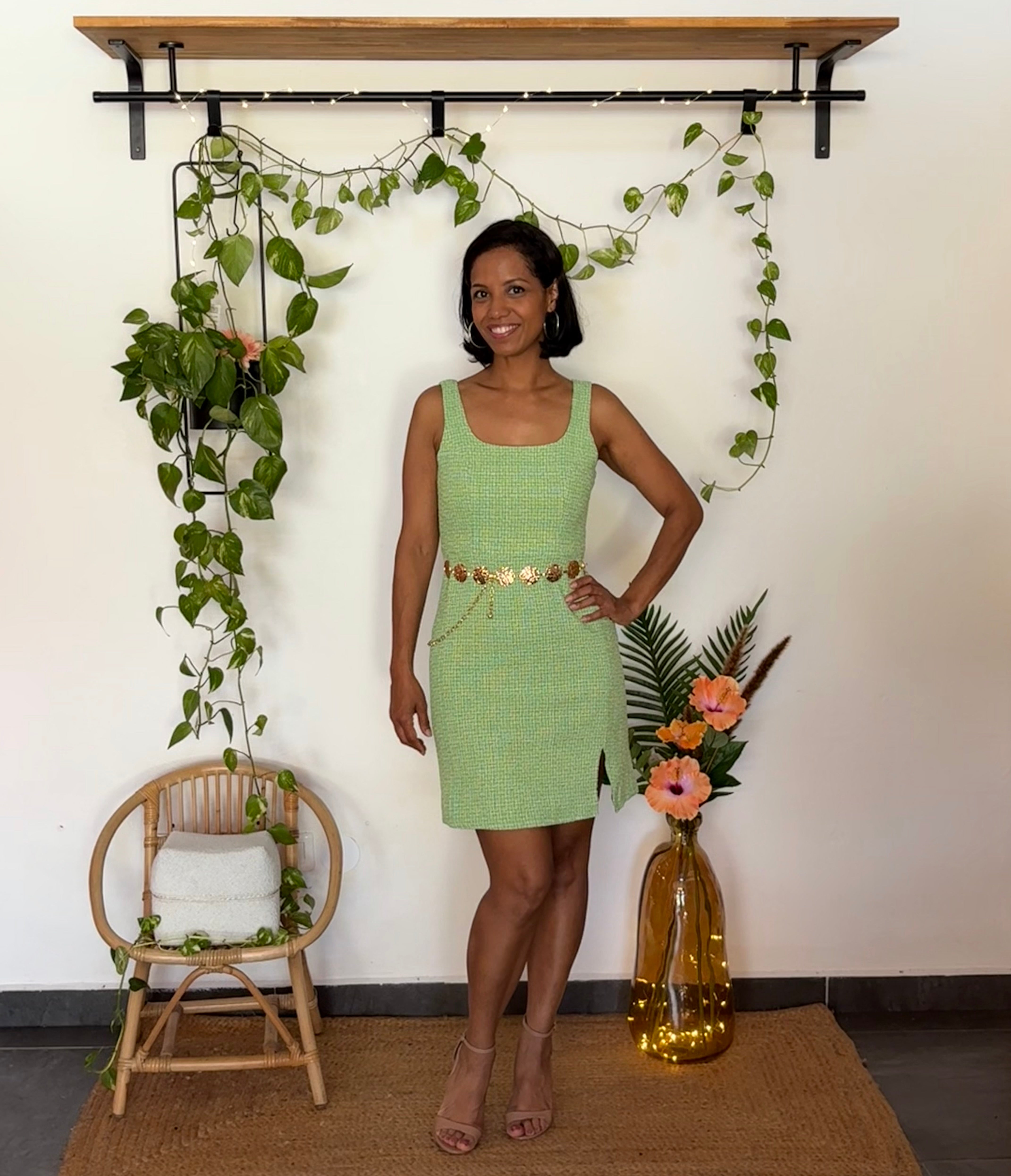Courte en tweed à encolure carré arrondie et larges bretelles, Coupe droite structurée, détail de fente sur l'avant gauche, fermeture par zip dans le dos par zip dissimulé dans la couture.