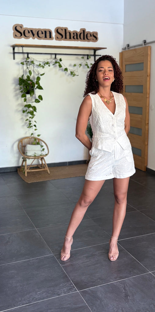 Ce duo en broderie anglaise respire la légèreté et la douceur. Le gilet sans manches structure la silhouette tandis que le short offre un tombé impeccable et confortable.