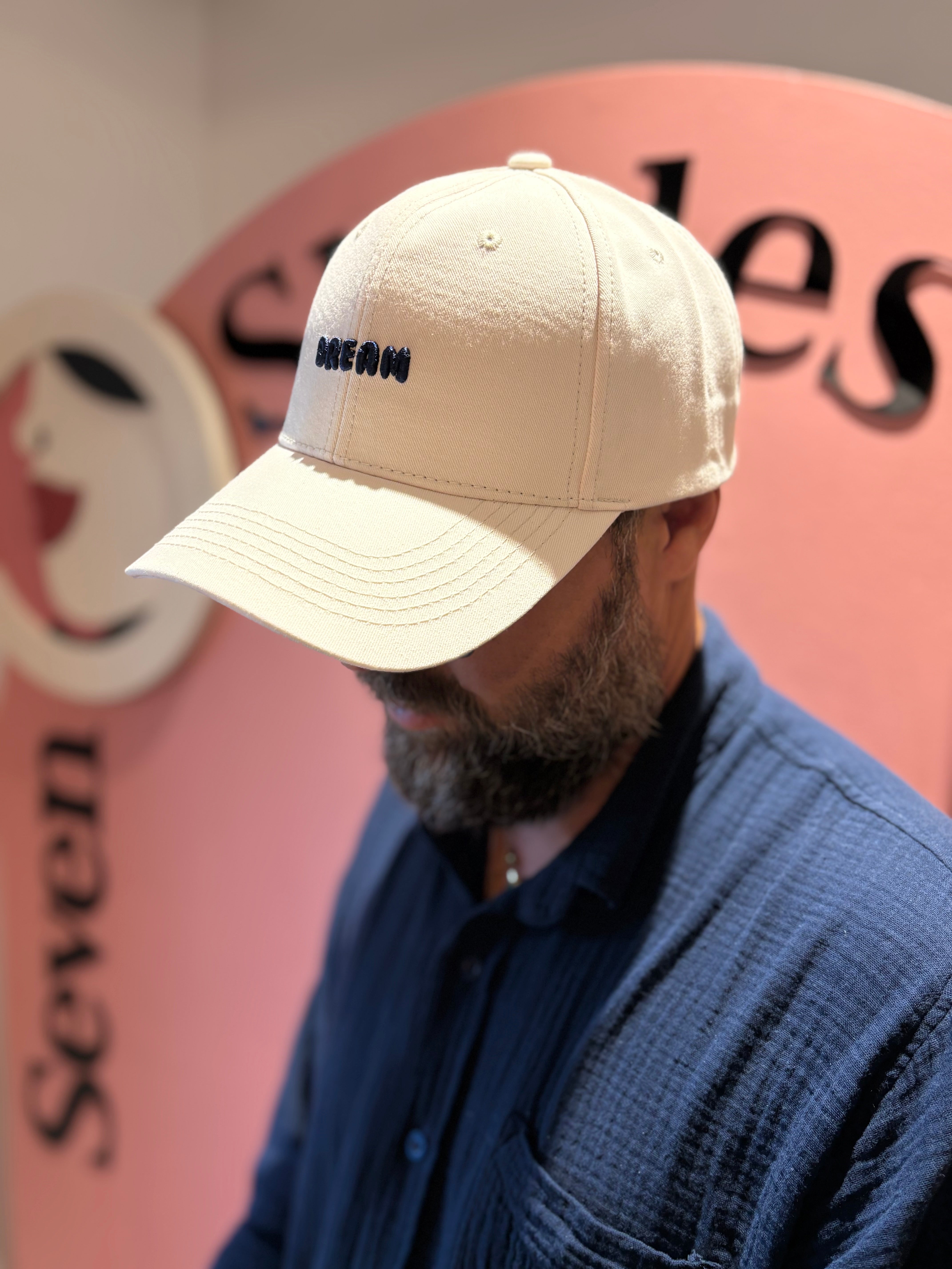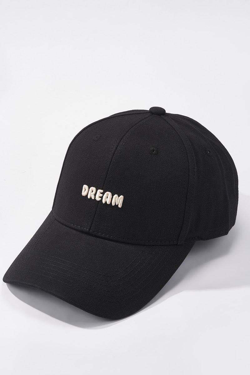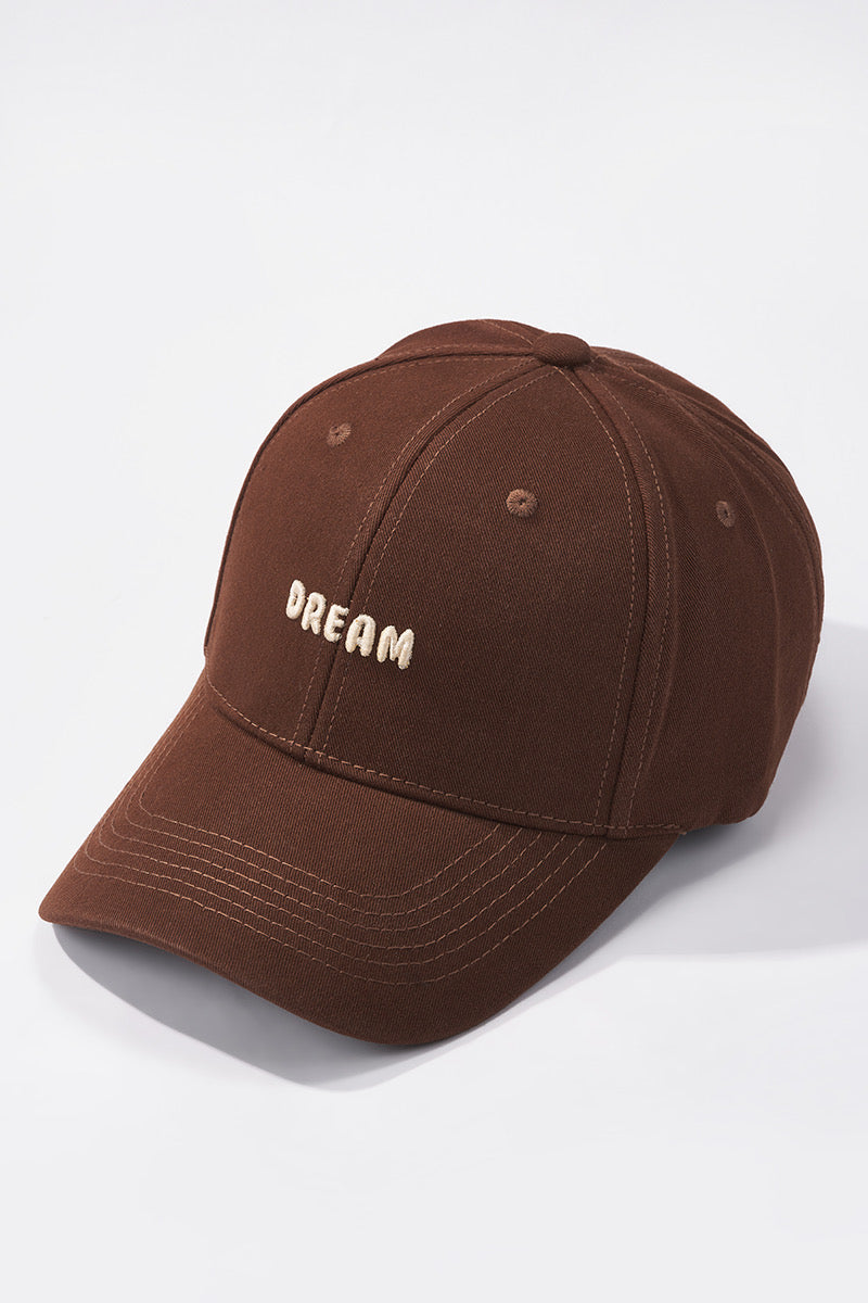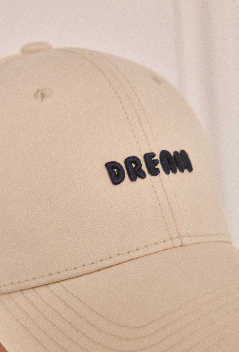 Évoquant l'élégance discrète, la casquette mixte en coton, ornée de la broderie DREAM, se décline en teintes délicates d'écru, de noir et de chocolat.