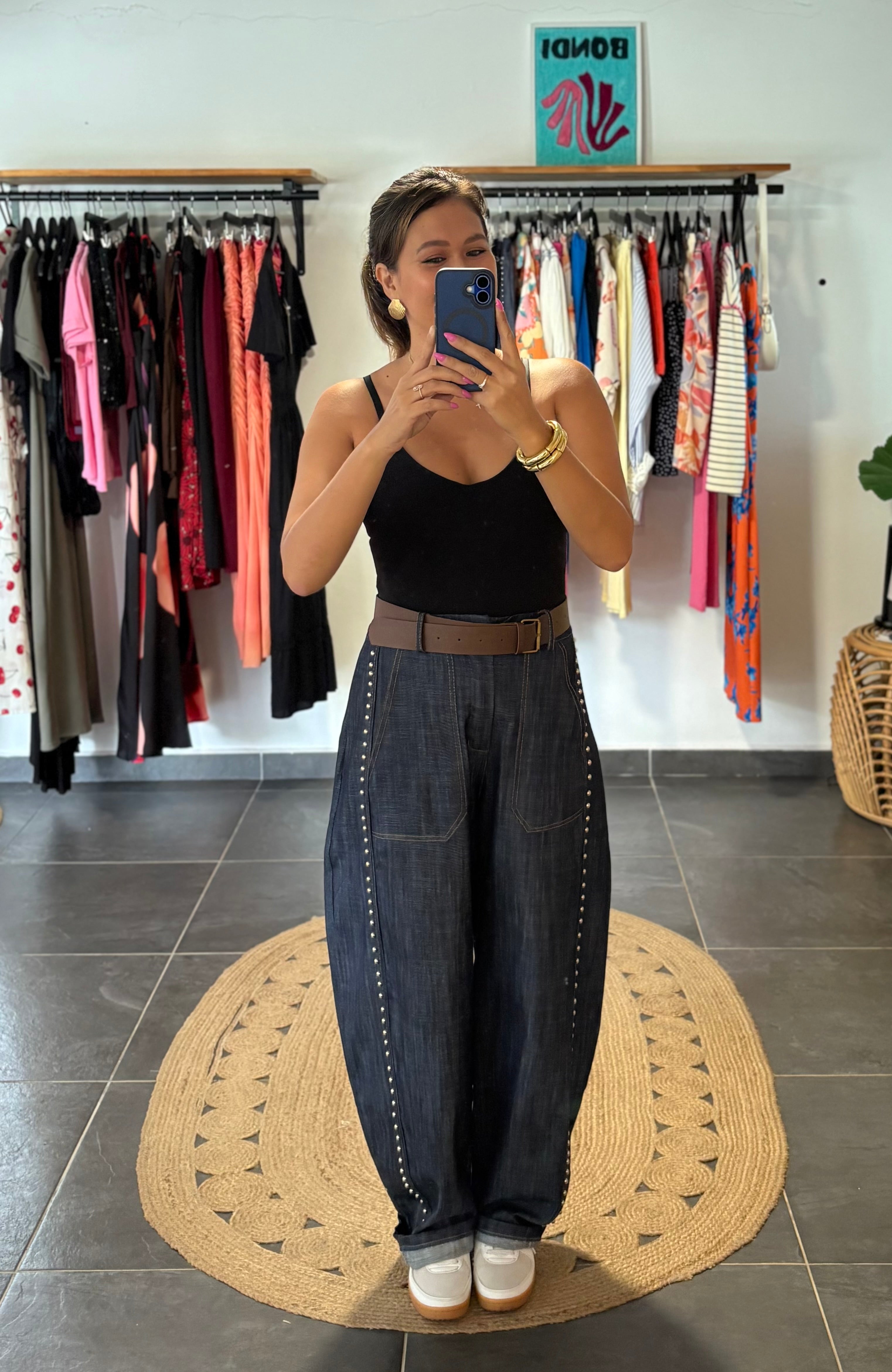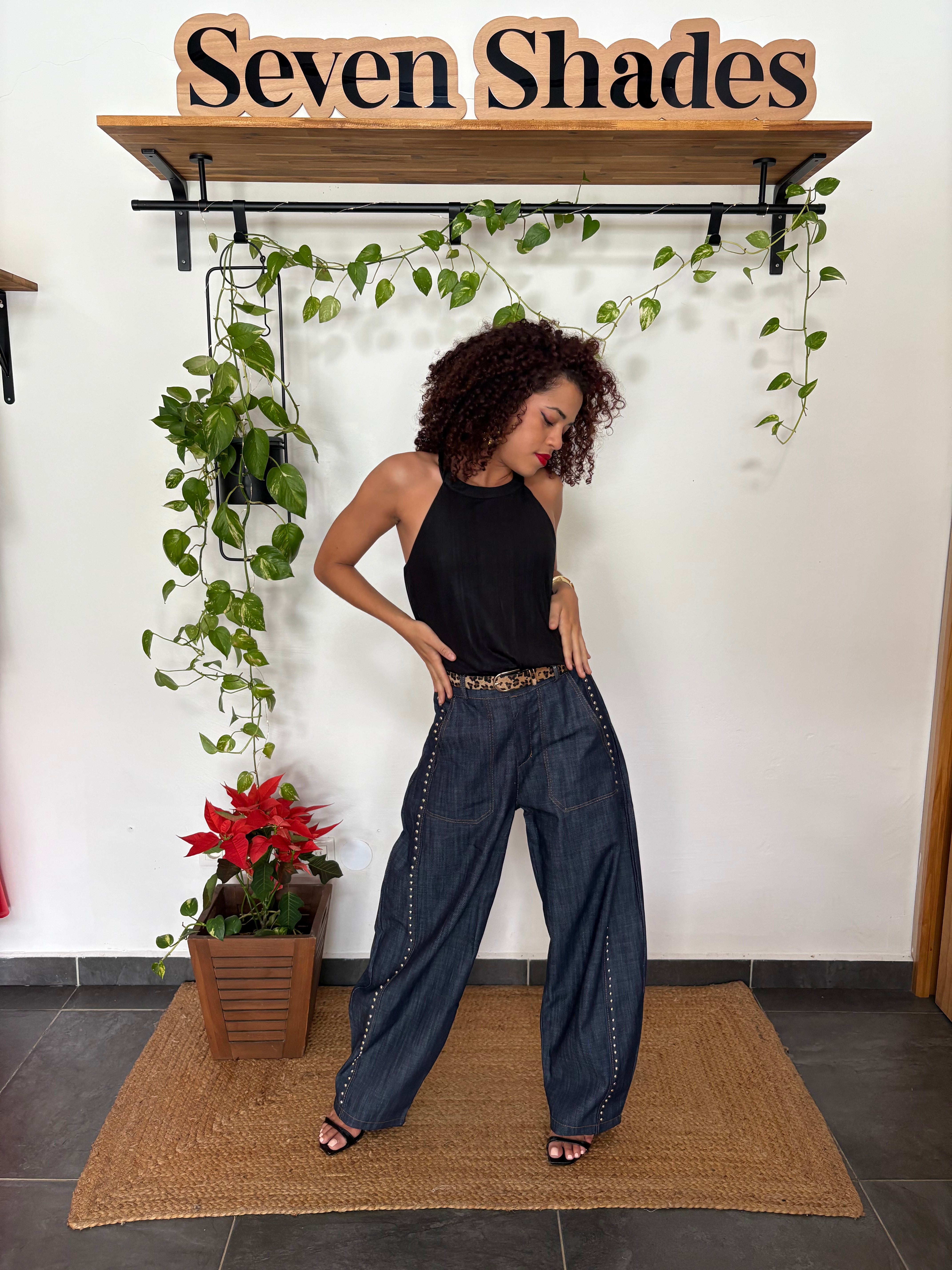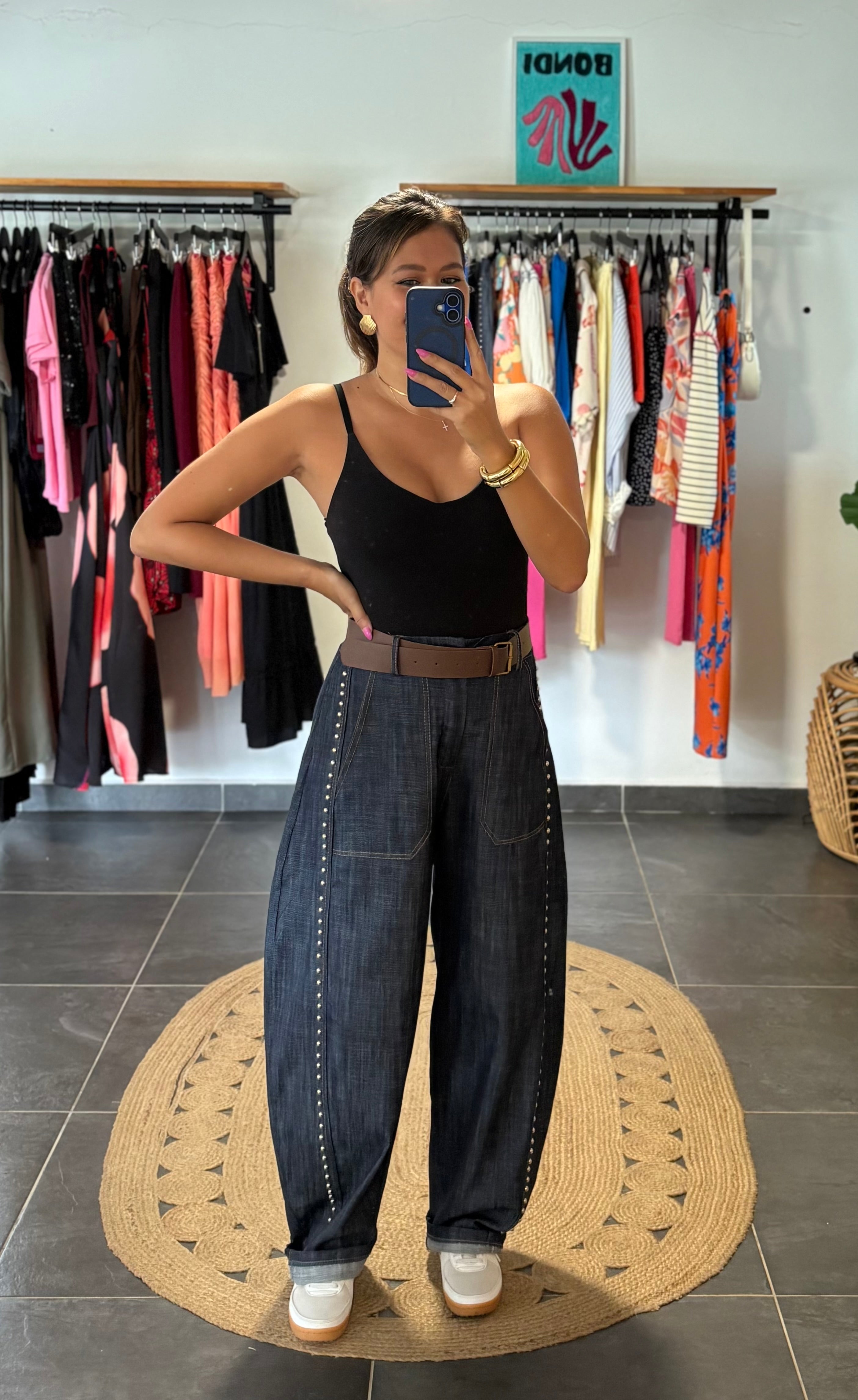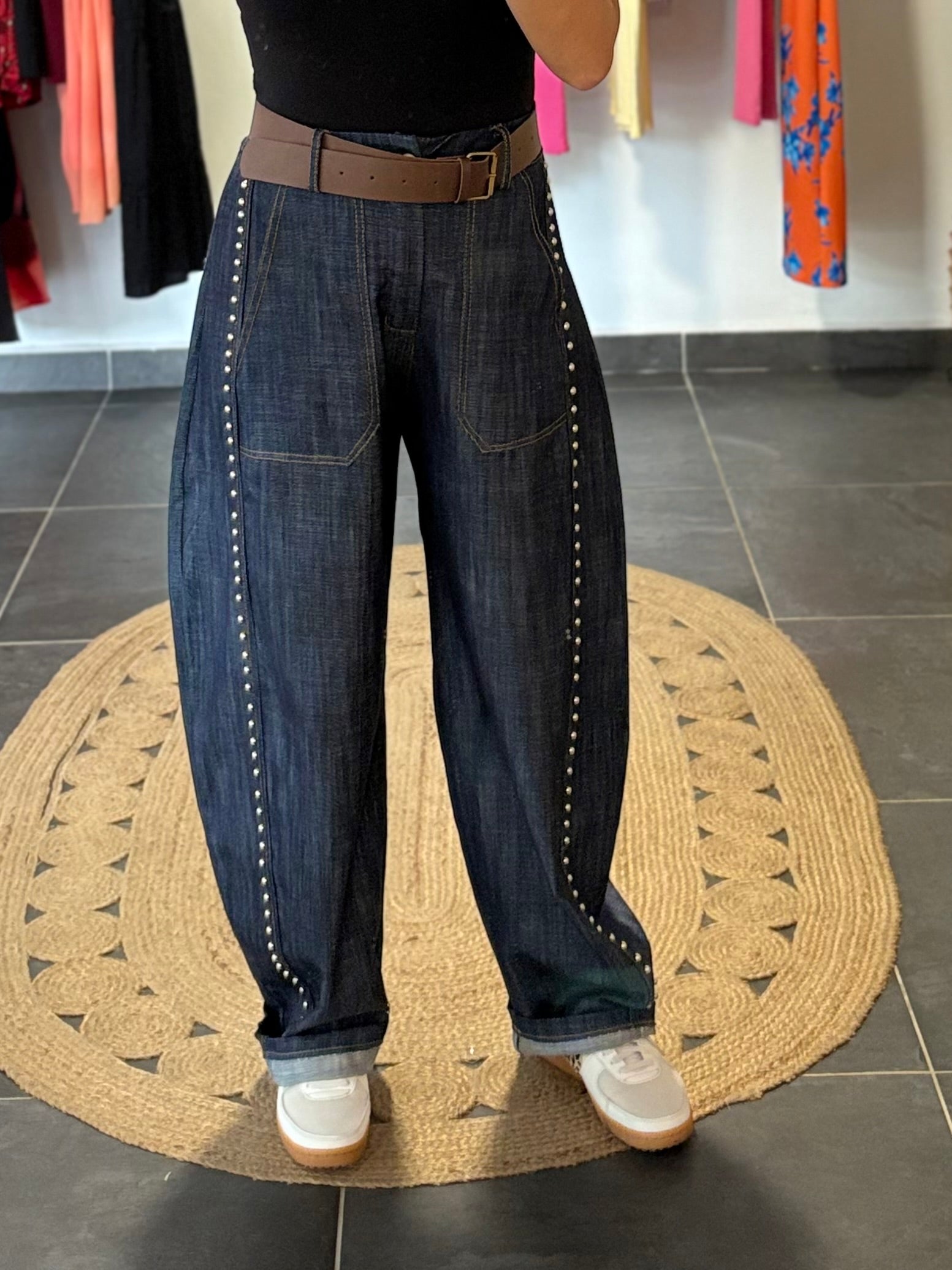 Embellissez votre garde-robe avec notre Pantalon Barrel JEAN à clous. Le jean en lui-même est tendance, mais avec les clous ajoutés, il devient unique.