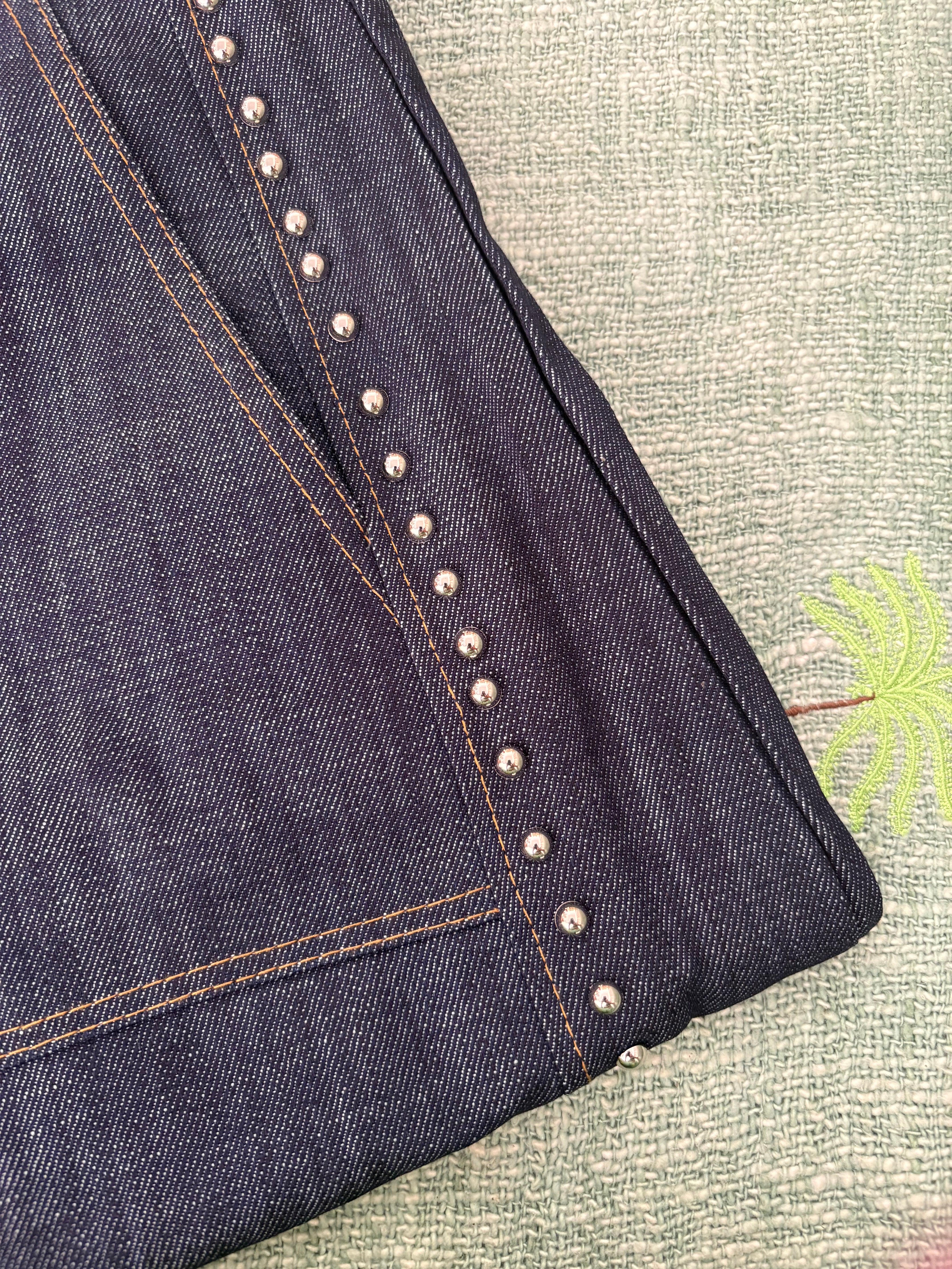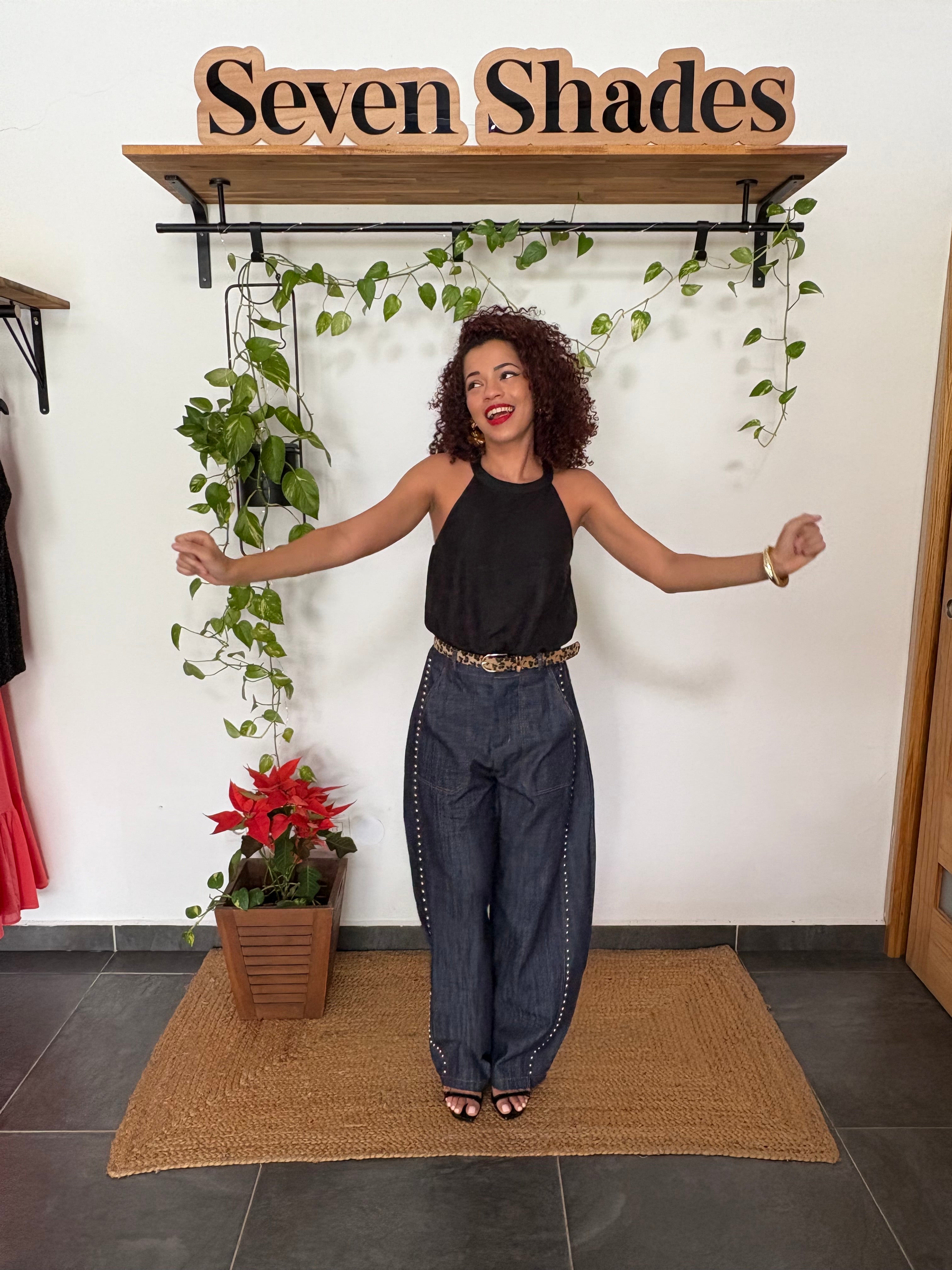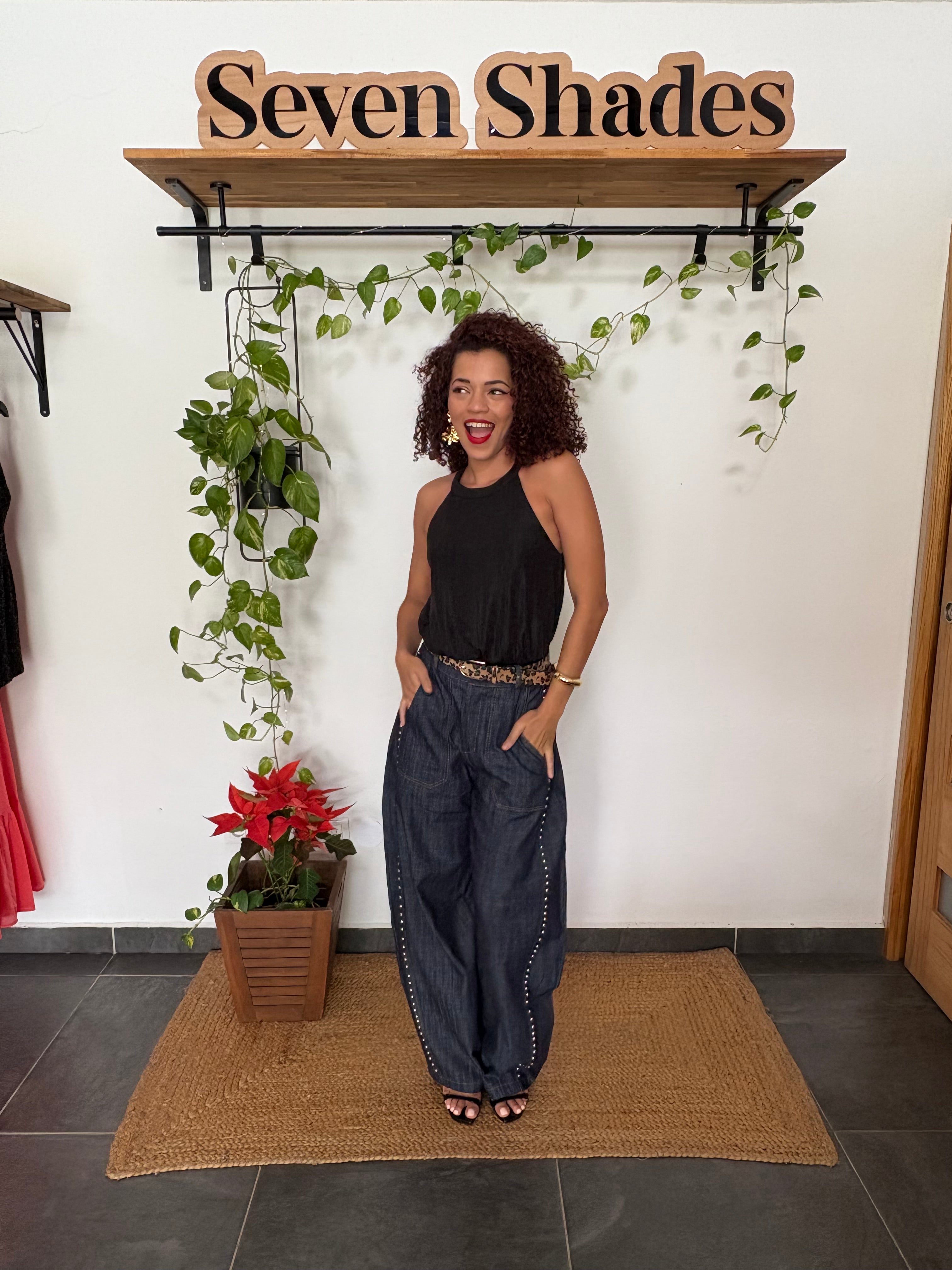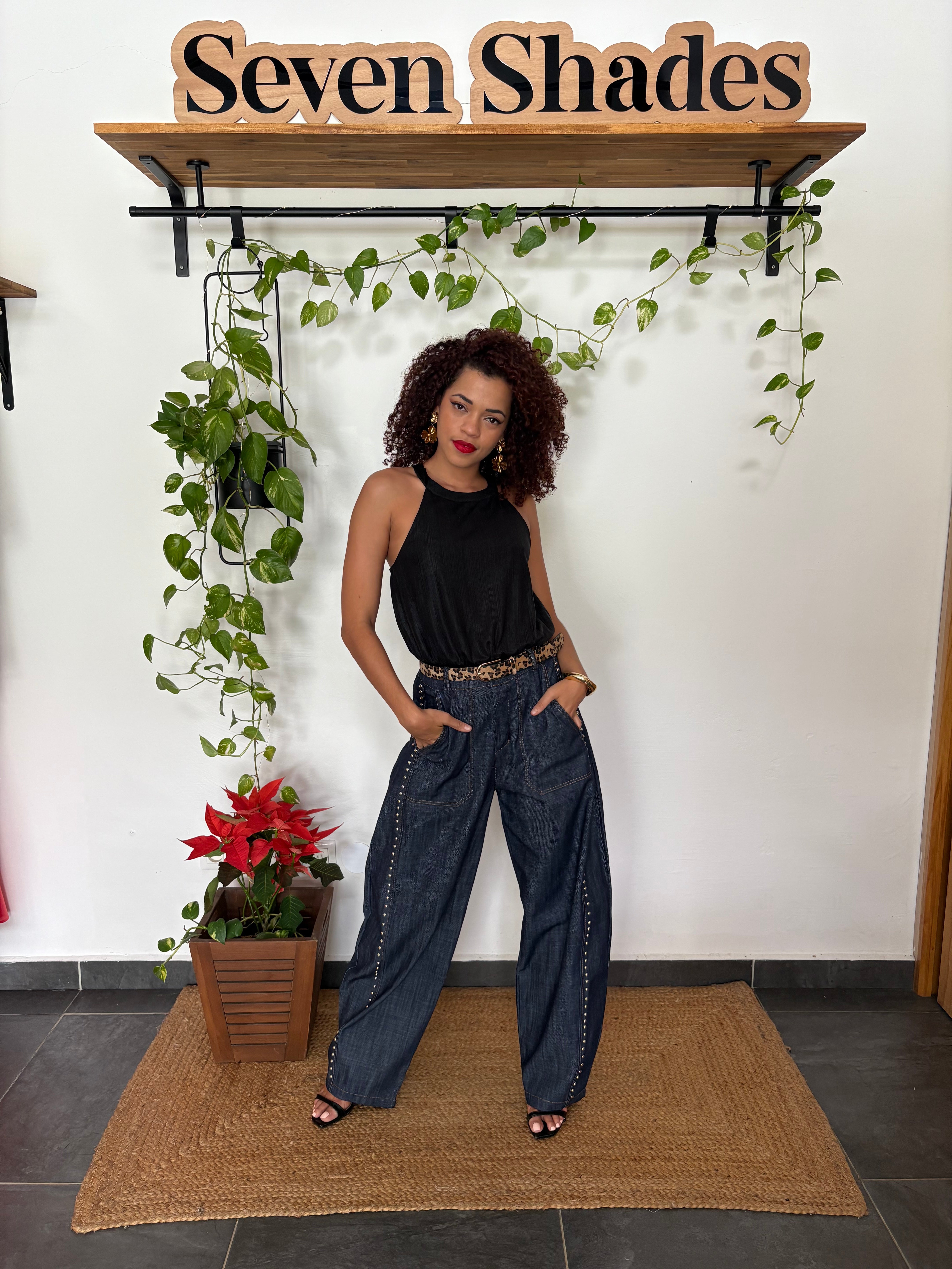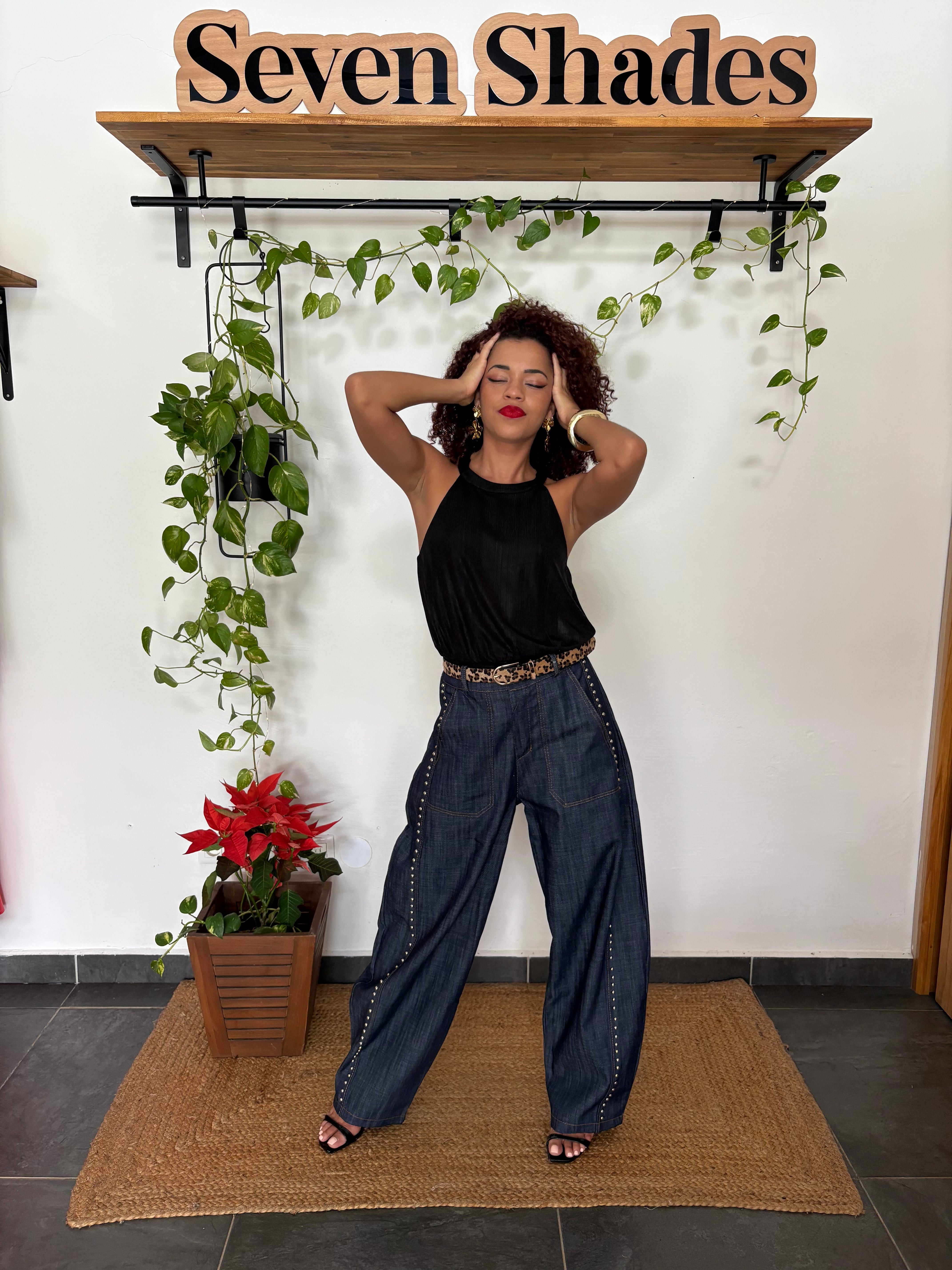 Embellissez votre garde-robe avec notre Pantalon Barrel JEAN à clous. Le jean en lui-même est tendance, mais avec les clous ajoutés, il devient unique.