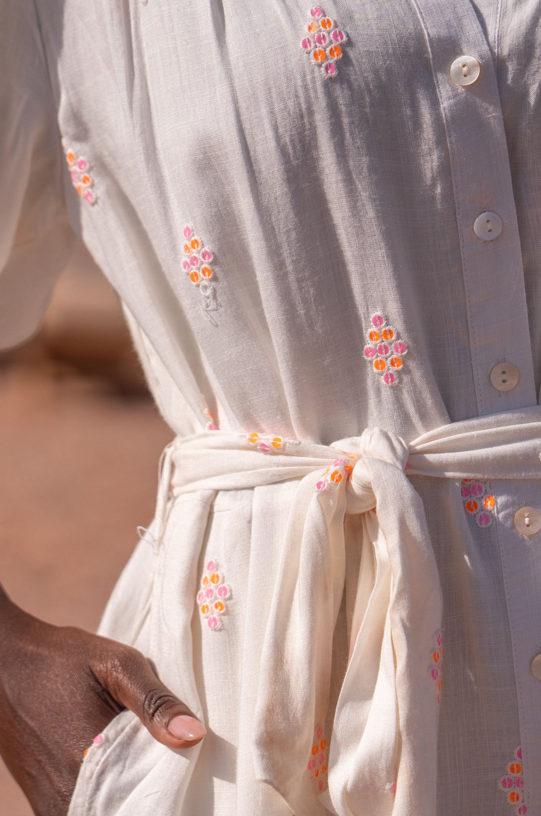 Ses manches légèrement ballon et sa ceinture ajoutent une touche élégante, tandis que les sequins oranges et roses illuminent votre look.