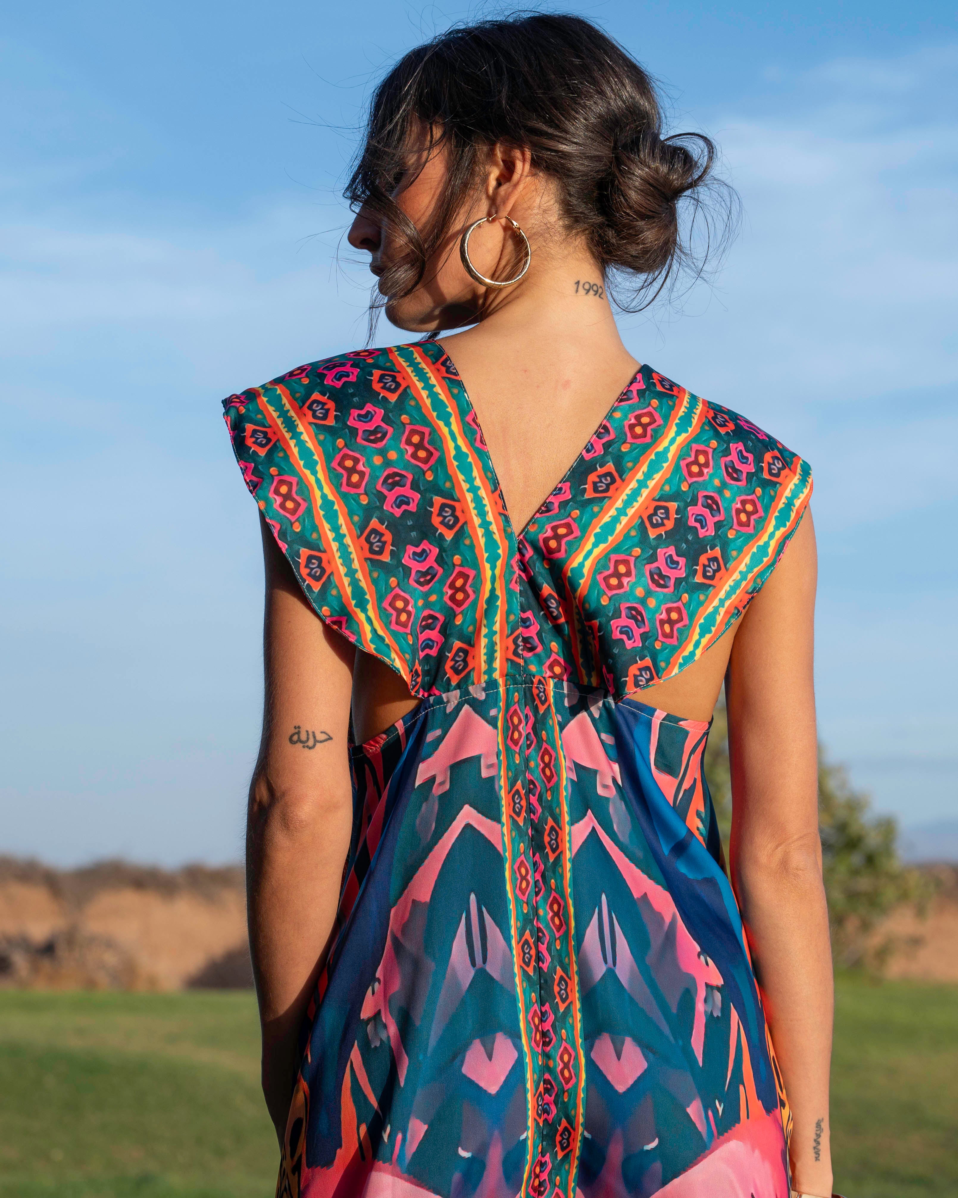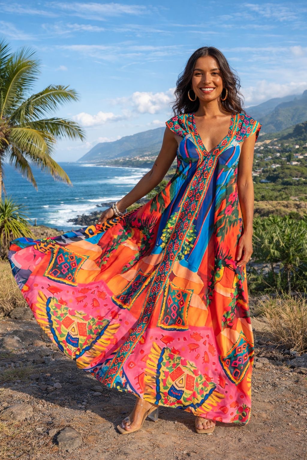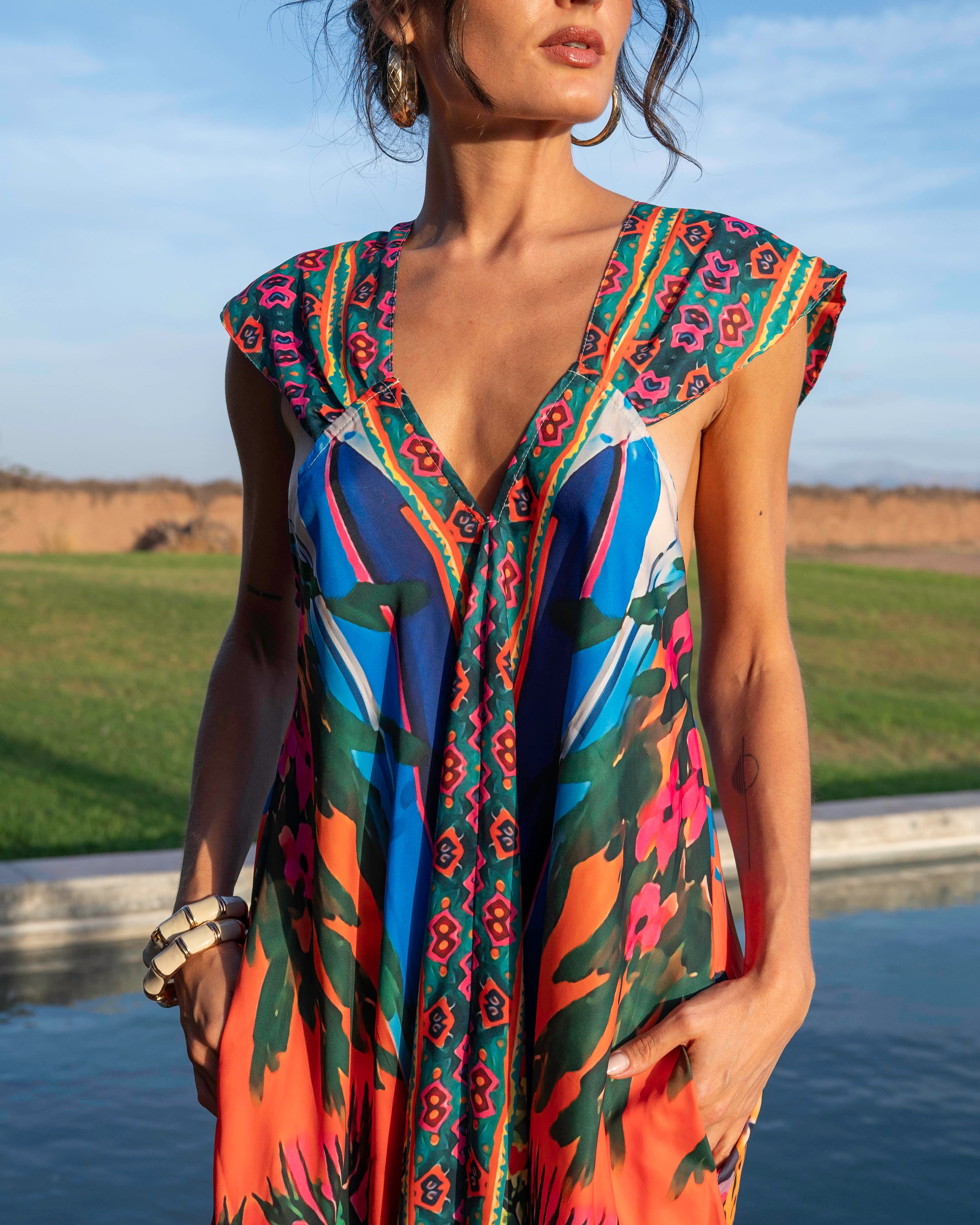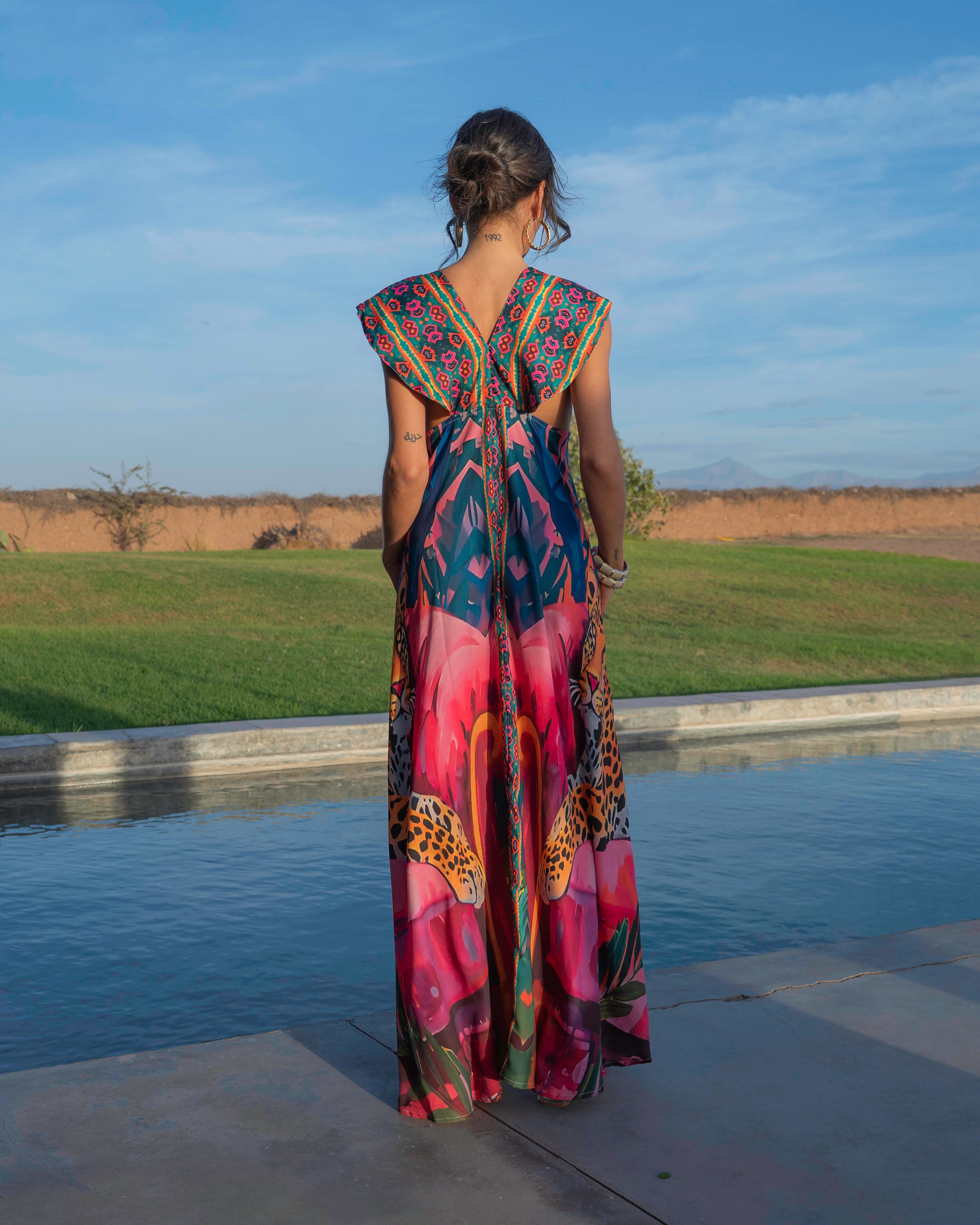 Confectionnée en viscose légère et fluide, cette robe longue accompagne chaque mouvement avec élégance. Son imprimé vibrant et solaire apporte instantanément du caractère et du pep’s à la silhouette.